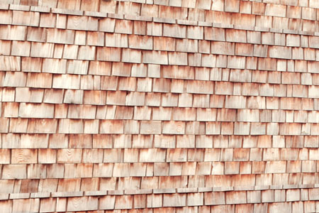 New England pine shingles laid in overlapping layers on the exterior frame. Most bundles of shingles are furnished in random widths and applied over sheathing and vapor barrier. Assumes exterior wall design attributes such as numerous corners, window and door shapes and openings typical of high value homes. Can also include high quality custom cut shingles.